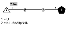 | Enzyme name: WeeH Enzyme GenBank ID: DAA64736.1 | Synthesized dimer: P(?-?)P Donor (ID 35225): Ac(1-2)[<<50%lS3HOBut(1-4)|50%Ac(1-4)>>]aDQuipN4N(1-P-P-5)xXnucU Acceptor (ID 34451): P-1)Subst // Subst = undecaprenol Status: evidence in vitro Confirmation methods: Sequencing (gene, protein) ID: 3850 Notes: phosphoglycosyltransferase | Organism (ID 6514): Acinetobacter baumannii AYE Full structure (ID 35226): Molecule role: membrane glycolipid | Morrison et al. 2013 DOI: 10.1016/j.abb.2013.05.011 |