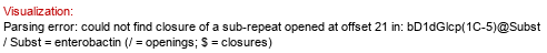 | Enzyme name: ItrA4 Enzyme GenBank ID: KMV25998.1 Gene name: itrA4 Gene cluster ID: MN958100.1 | Synthesized dimer: P(?-?)P Donor (ID 33991): ?DGalp(1-P-P-5)xXnucU Acceptor (ID 34451): P-1)Subst // Subst = undecaprenol Status: predicted in silico Confirmation methods: Sequencing (gene, protein) ID: 3822 Notes: gene cluster name: KL92, phosphoglycosyltransferase | Organism (ID 17310): Acinetobacter baumannii B8300 Full structure (ID 35199): Molecule role: CPS | Senchenkova et al. 2021 DOI: 10.1016/j.resmic.2021.103815 |