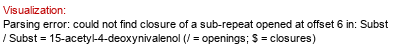 | Enzyme name: 73C5 UniProt ID: Q9ZQ94.1 CAZy family: GT1 Gene name: DOGT1 / At2g36800 Gene GenBank ID: 818252 | Synthesized dimer: bDGlcp(1-3)Subst // Subst = 15-acetyl-4-deoxynivalenol Donor (ID 33557): ?DGlcp(1-P-P-5)xXnucU Acceptor (ID 33717): Subst // Subst = 15-acetyl-4-deoxynivalenol Status: evidence in vitro Confirmation methods: expression in yeast (as whole-cell biocatalyst) ID: 1244 | Organism (ID 9805): Arabidopsis thaliana Expressed in: S. cerevisiae Full structure (ID 33718): | Poppenberger et al. 2003 DOI: 10.1074/jbc.M307552200 |